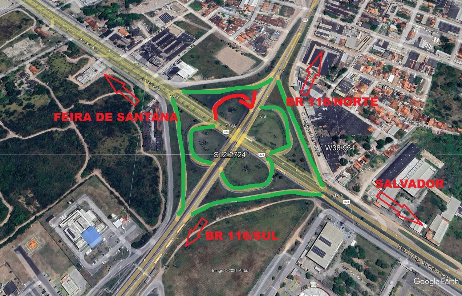 Deverão seguir pela BR-324, utilizando o contorno Leste, e acessar diretamente a BR-116 Sul por meio do viaduto sul, prosseguindo no sentido Vitória da Conquista/Rio de Janeiro.